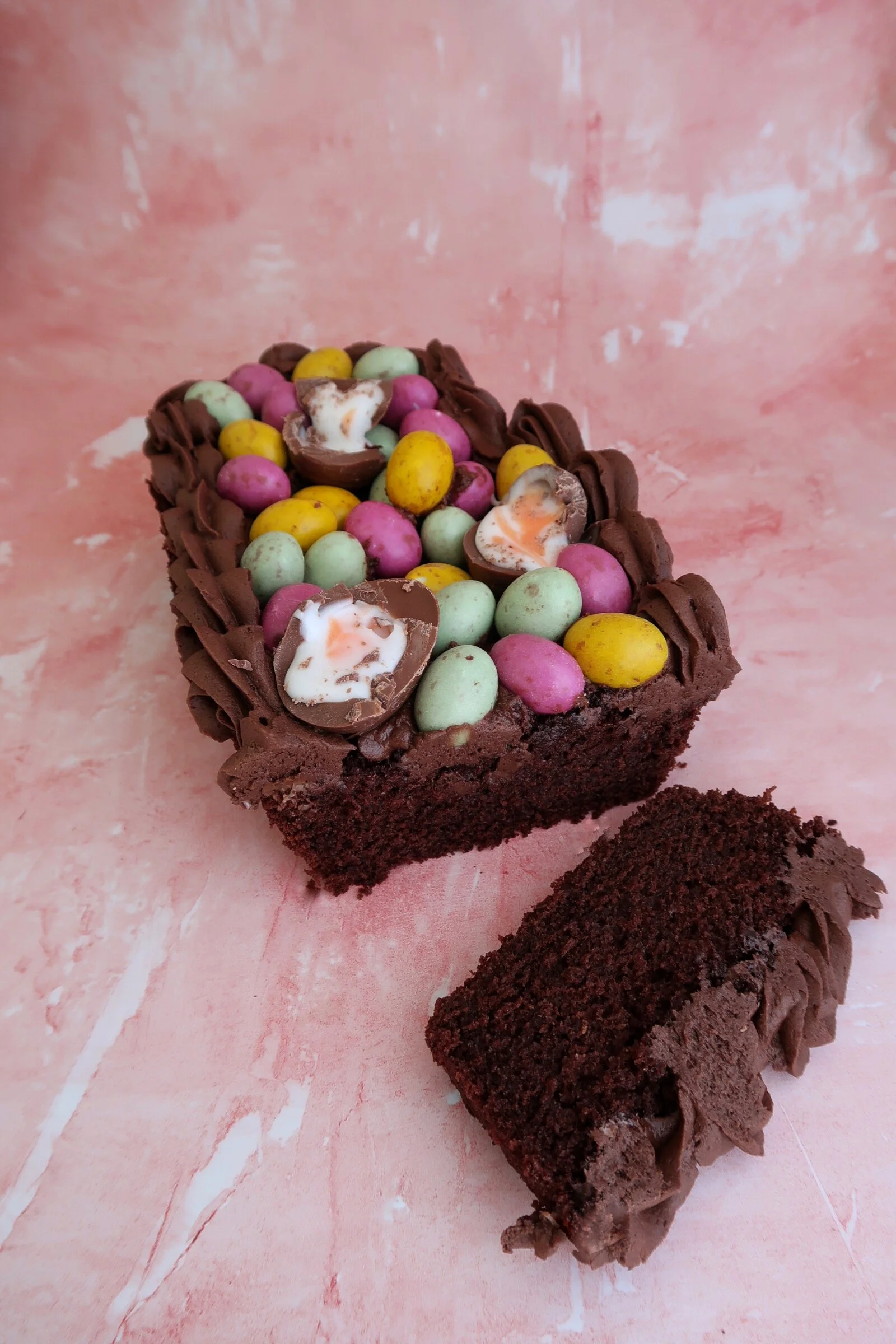 This Easter loaf cake has a moist but fluffy chocolate sponge, a deliciously creamy chocolate buttercream icing, and can be topped with any and all of your favourite Easter chocolates!